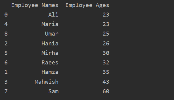 In this example, we will sort the Employee’s age in ascending order. Using the following piece of code, we have retrieved the ‘Employee_Age’ in ascending order with ‘Employee_Names’.