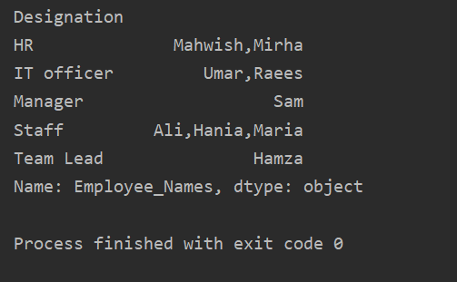 In the following example, we have sorted data based on the employees ‘Designation’ column and joined the Employees who have the same designation. The lambda function is applied on ‘Employees_Name’.