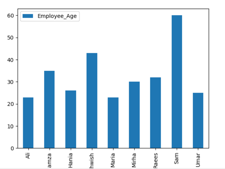 Here, the following example visualizes the ‘Employee_Age’ with ‘Employee_Nmaes’ from the given DataFrame by using the groupby statement.
