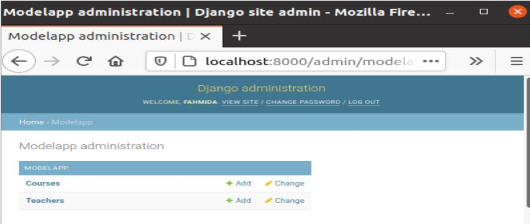 Modify the content of the admin.py file with the following content. Here, Teacher and Course classes of the models are registered by using the register() method to display the Teachers and Courses tables in the Django administration dashboard.