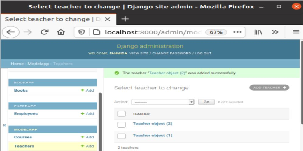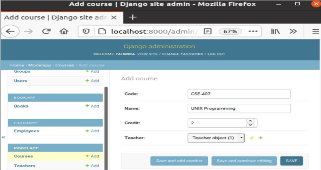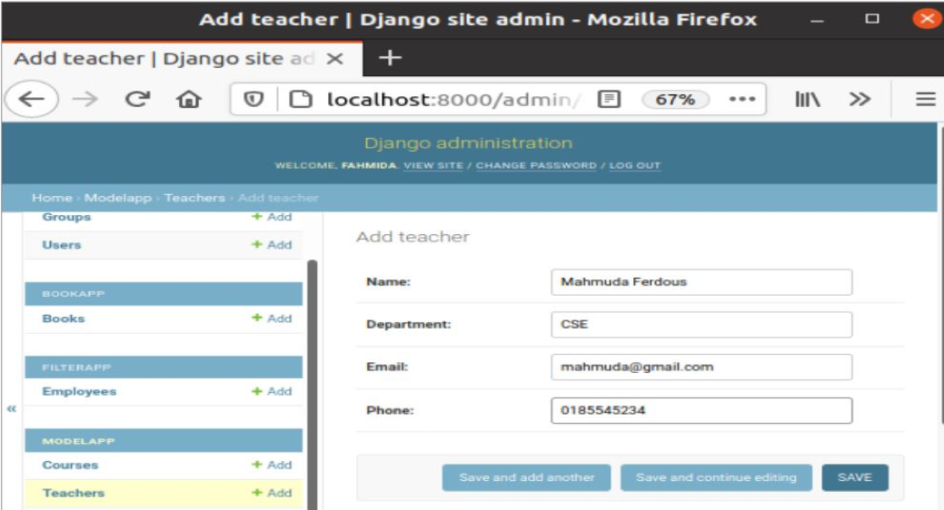 Click on the Teachers table to insert some records into the table. A form with the necessary fields like the following image will appear for inserting record. There are three buttons in the form to insert records in the table. ‘Save and add another‘ button is used to insert the record and open the form again for inserting the next record. The ‘Save and continue editing‘ button is used to insert the record and open the form again with the data for editing. The ‘Save‘ button is used to insert the record only. Every entry form will contain these three buttons.