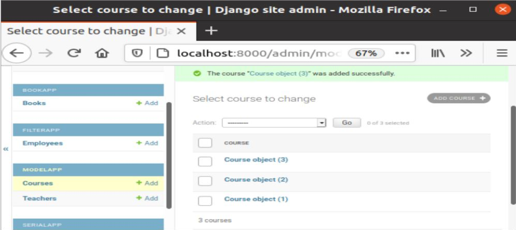 After inserting three records into the Courses table, the following information will appear in the browser. If you want to modify any records of the Courses or the Teachers table, then click on that particular object to open the edit form with the existing data.