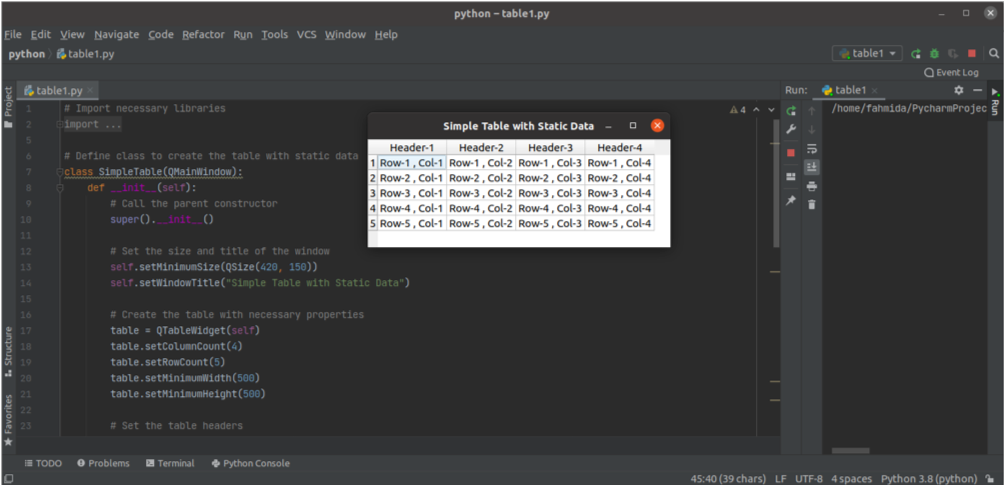 The following window with a table will appear the above script is executed. According to the values of the for loops, the cell value of the first row and the first column is ‘Row-1, Col-1,’ and the cell value of the last row and last column is ‘Row-5, Col-4.’