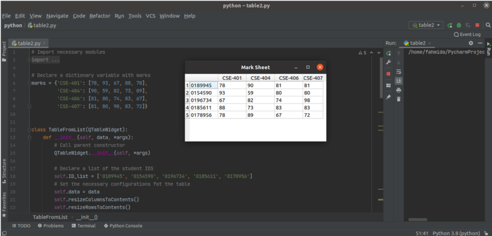 The following script creates a table with the content of a Python dictionary and list using the QTableWidget class. The script also adds a tool-tip text for the table header. A Python dictionary named marks is also declared in the script. The course codes are used as the key values of the dictionary. A Python list is declared to define the student IDs. The key values of the dictionary are added to the header of the table, the values of the list are added to the first column of the table, and the values of the dictionary are added to the other columns of the table.