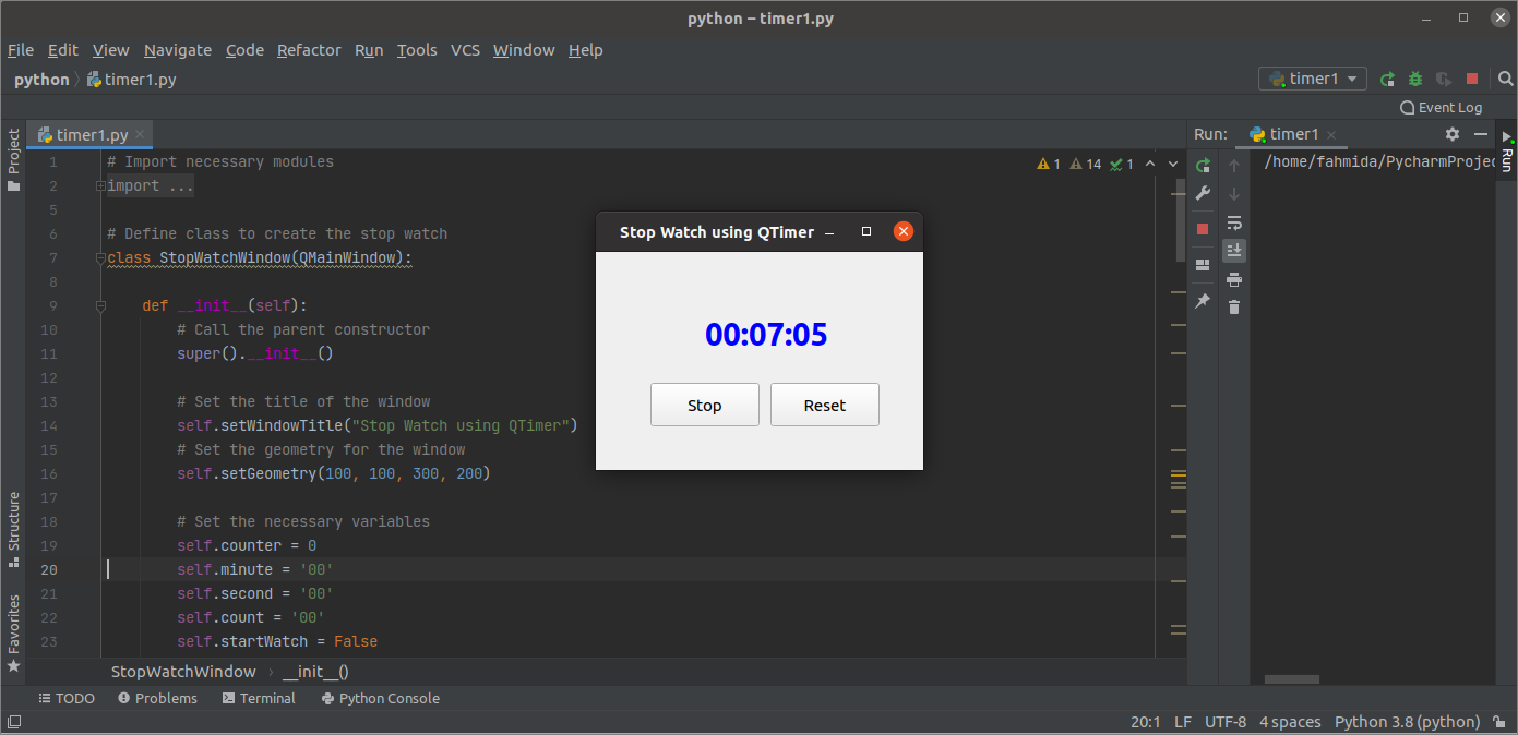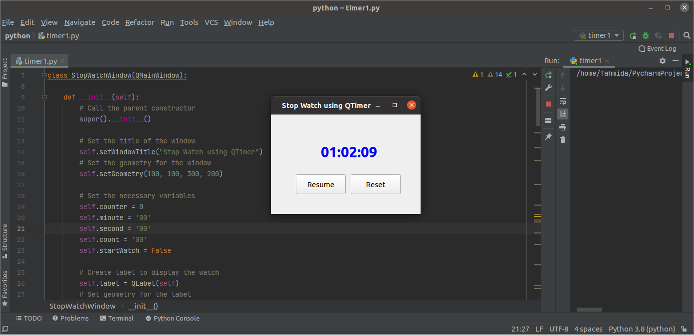 The following script will implement a stopwatch application in Python using the QTimer class. This application will count the number of seconds and the number of minutes. Two buttons are used to start, stop, resume, and reset the counter. When the user clicks the Start button, the counter will start counting, and the caption of the Start button will be changed to Stop. When the user clicks the Start button with the caption Stop, the counter will stop temporarily, and the caption of the Start button will be changed to Resume to continue the counter to the next time. When the user clicks the Reset button, all the values of the counter will be initialized to 0.