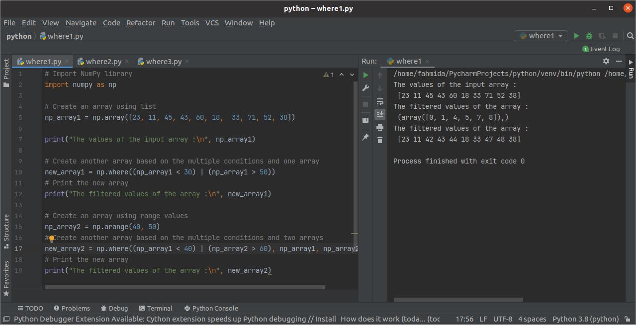 The following example shows the use of the where() function with and without the optional argument. Here, the logical OR has used to define the condition. The first where() function has applied in a one-dimensional array that will return the array of indices of the input array where the condition will return True. The second where() function has applied in two one-dimensional arrays will retrieve the values from the first array when the condition will return True. Otherwise, it will retrieve the values from the second array.