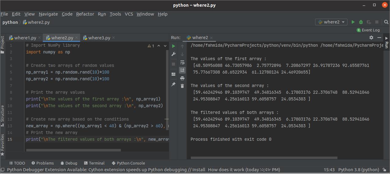 The following example shows how the () function can be used with the multiple conditions defined by logical and applied in two one-dimensional arrays. Here, two one-dimensional NumPy arrays have been created by using the rand() function. These arrays have been used in the where() function with the multiple conditions to create the new array based on the conditions. The condition will return True when the first array’s value is less than 40 and the value of the second array is greater than 60. The new array has printed later.