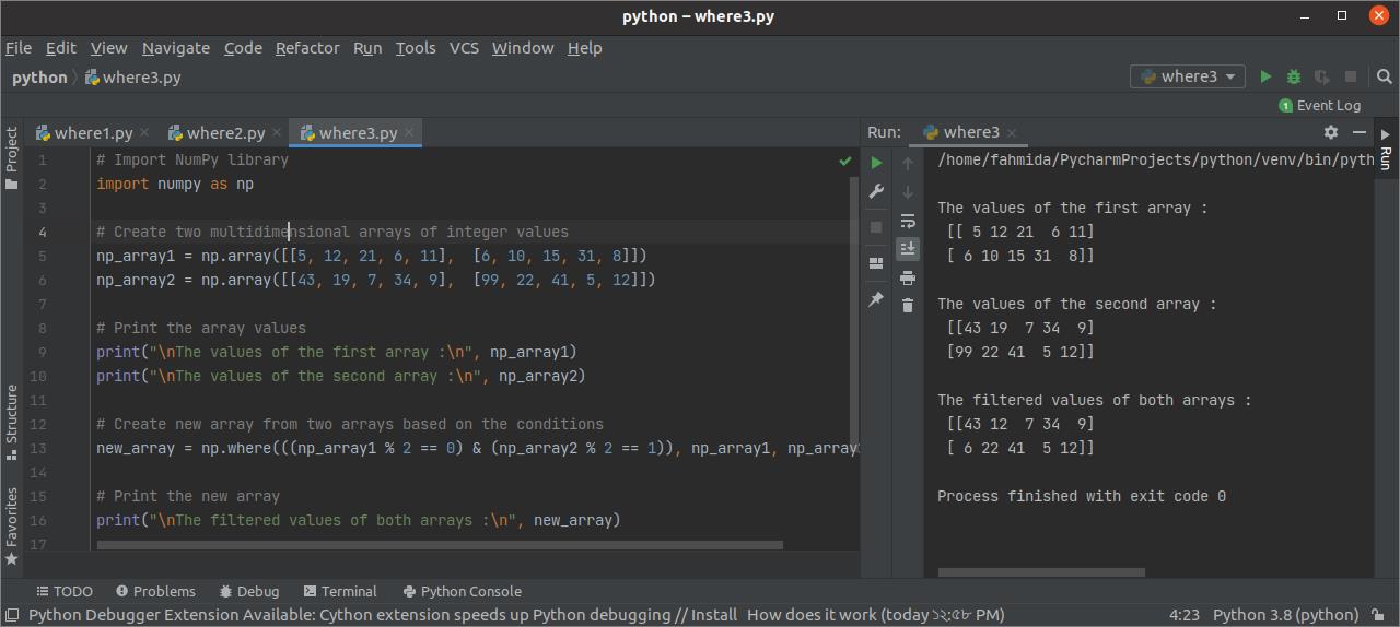 The following example shows how where the () function can be used with the multiple conditions defined by logical AND that will be applied in two multi-dimensional arrays. Here, two multi-dimensional arrays have been created by using lists. Next, these functions have applied in where() function to create the new array based on the condition. The condition used in the function will return True where the value of the first array is even and the value of the second array is odd; otherwise, the condition will return False.