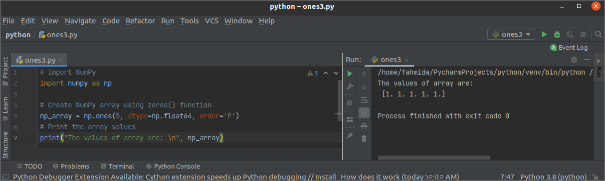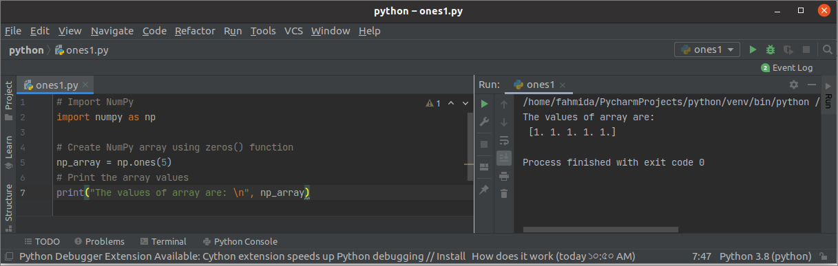 The following example shows the use of the ones() function with one argument. ones() function of this script will create a one-dimensional array of 5 elements.