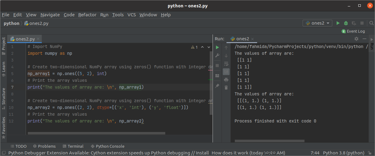 The following example shows the use of the ones() function with two arguments. The first ones() function will create a two-dimensional array of integers that will contain 5 rows and 2 columns. The second ones() function will create a two-dimensional array where the first column will contain integers and the second column will include floats.