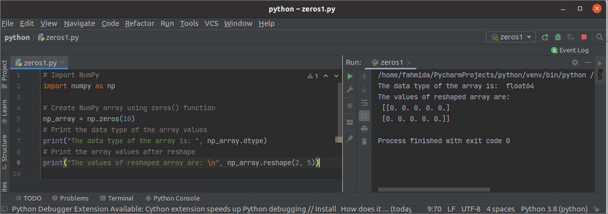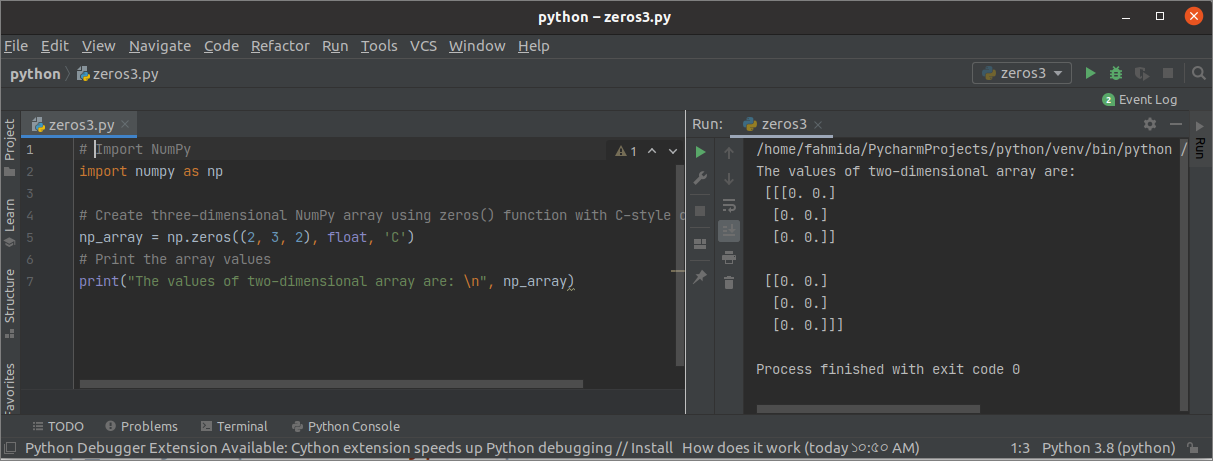 The following example shows the use of the zeros() function with three arguments. The zeros() function of the script will create a three-dimensional NumPy array float numbers. The data type and the first array’s values will be printed in the next statement based on C-style ordering.