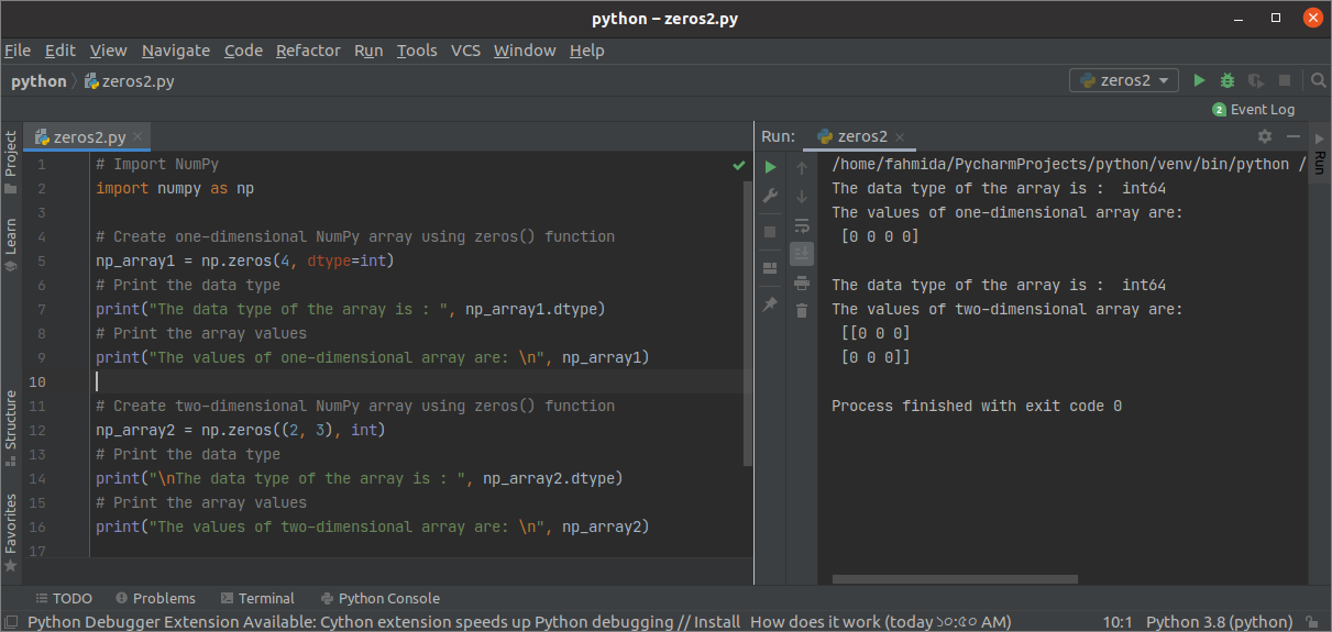 The following example shows the use of the zeros() function with two arguments. The first zeros() function of the script will create a one-dimensional NumPy array of integers. The data type and the values of the first array will be printed in the next statement. The second zeros() function of the script will create a two-dimensional NumPy array of integers. The data type and the values of the second array will be printed in the next statement.