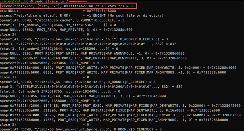 Hence, in the first line, the system call is execve (execute program using the specified array of arguments), the arguments of the system call are (“/bin/ls”, [“ls”, “/”], 0x7fffc4b277a8 /* 13 vars */) and a return value of 0.