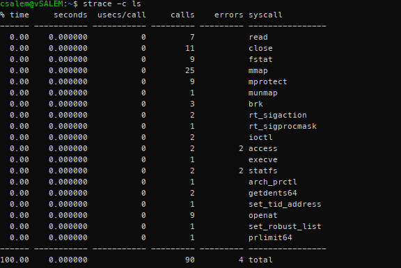 Strace also allows us to get a summary of system calls made by a process. By passing the -c or –summary-only argument, we can get an output such as the one shown below: