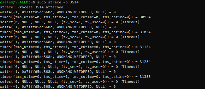Strace will continuously trace the attached process and show output as the attached process executes system calls. To terminate the trace, press CTRL + C, which detaches the process from the strace.