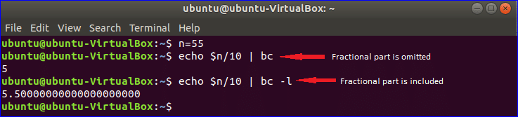 bc command is another way to do arithmetic operation in BASH. Run the following commands from the terminal. When you use bc command only for doing any arithmetic operation then fractional parts are omitted from the result. You have to use -l option with bc command to get the result with fractional value.