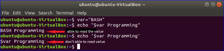 Double quotation can be used to read the value of the variable. In this example, single quotation is used on one echo statement and double quotation is used on another echo statement. Run the following commands from the terminal to check the output.