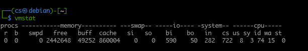 To use the vmstat tool, execute the command vmstat in the terminal. You will get an output similar to the one shown below: