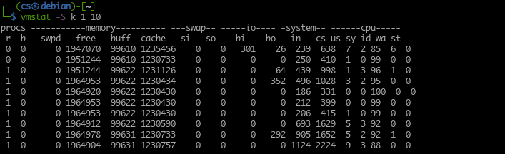 Where you want to use megabytes to display memory size, use the -S m argument, and Vmstat will report one megabyte as equivalent to 1000 kilobytes.