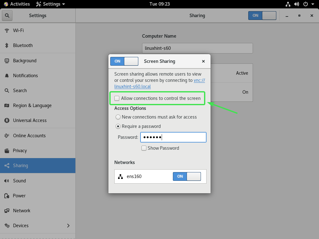 To remotely control your CentOS 8 machine, check Allow connections to control the screen from the Screen Sharing window.