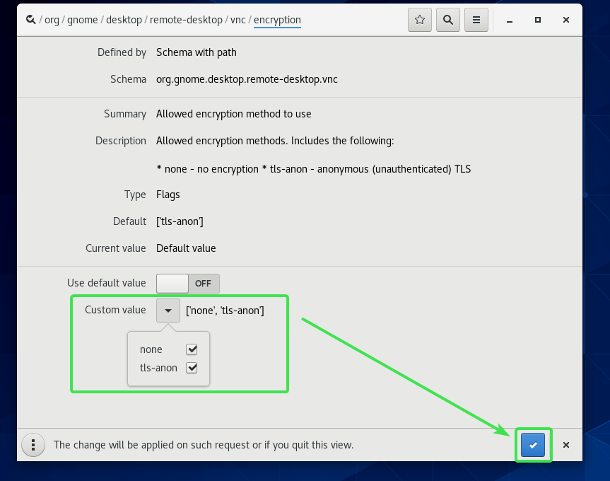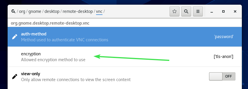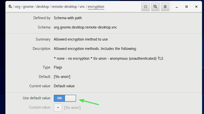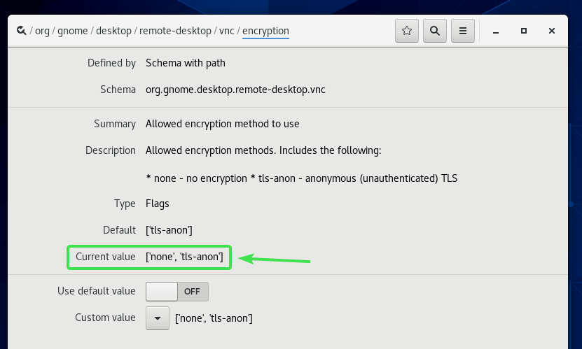 The Current value should be [‘none’,’tls-anon’] as shown in the screenshot below. Now, close Dconf editor.