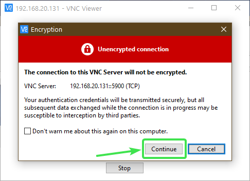 Now, if you try to connect to your CentOS 8 machine from VNC Viewer, you will see the following warning message. Click on Continue.