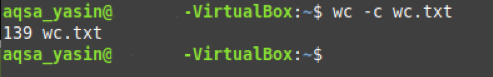 Here, you should replace the File with the name of the file whose byte count and name you want to be displayed on your terminal. We have replaced it with wc.txt, i.e., the name of our dummy file.
