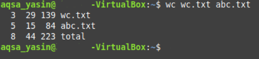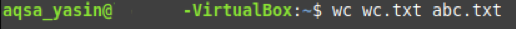 Here, you should replace File1 and File2 with the exact names of the files whose statistics you want to be displayed on your terminal. We have replaced them with wc.txt and abc.txt, i.e., the names of our dummy files. You can even mention the names of more than two files.