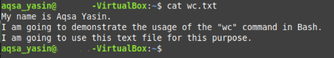 We also want to state here that for demonstrating the usage of the “wc” command in Bash in Linux Mint 20, we have created a random file named wc.txt. We have used the very same file in all the eight examples described below. You can see the contents of this file by running this command.