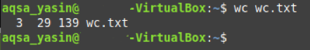 Here, you should replace the File with the name of the file whose line count, word count, character count, and name you want to be displayed on your terminal. We have replaced it with wc.txt, i.e., the name of our dummy file.