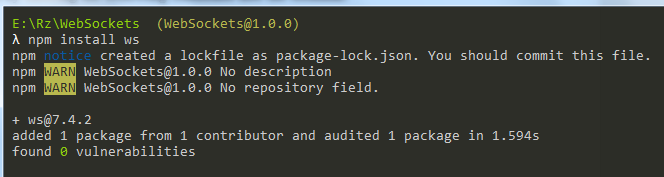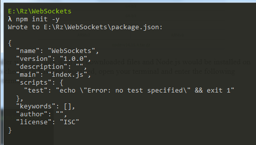 This command is used to create the package.json file that allows you to set up and install different Node.js packages. Install the WebSocket protocol package by issuing the following command in the terminal: