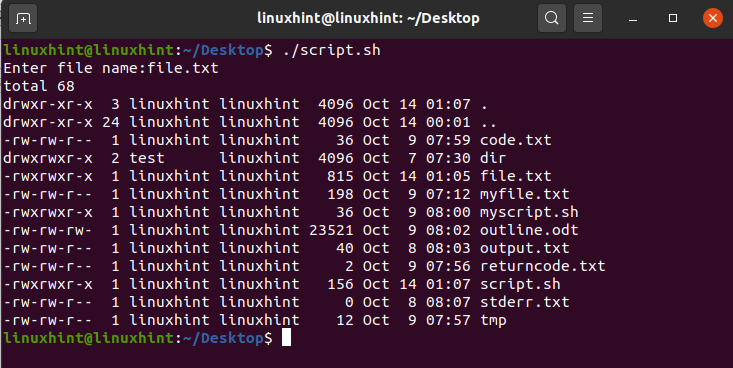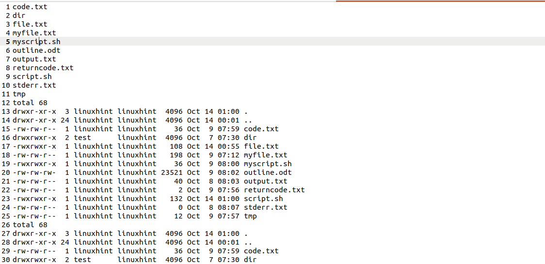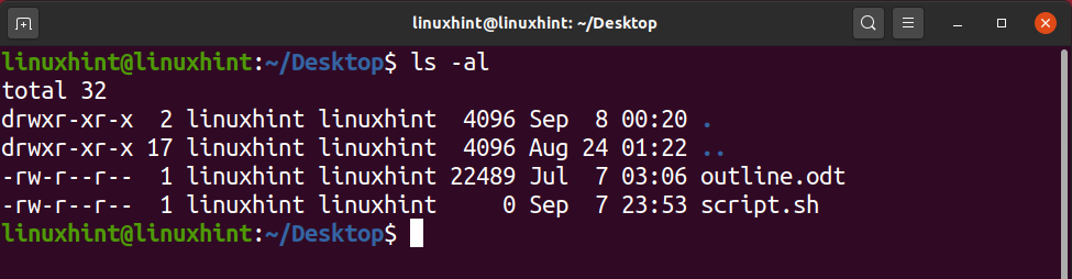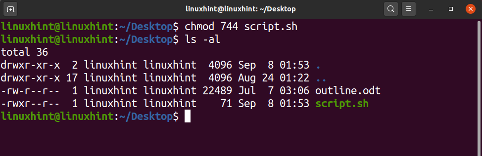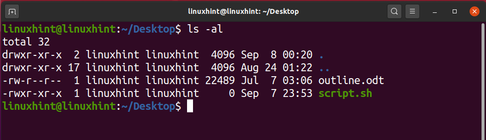 You can see ‘script.sh’ written in white color which is a sign that the script is a non-executable file as executable files are usually in green color. Further, take a look at the left side where we could see a pattern like “-rw-r–r–” which reflects that the file is only readable and writeable.