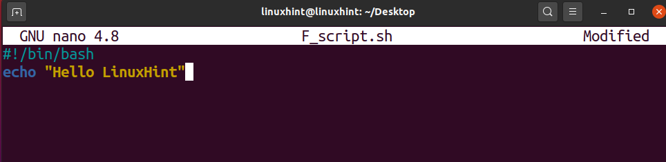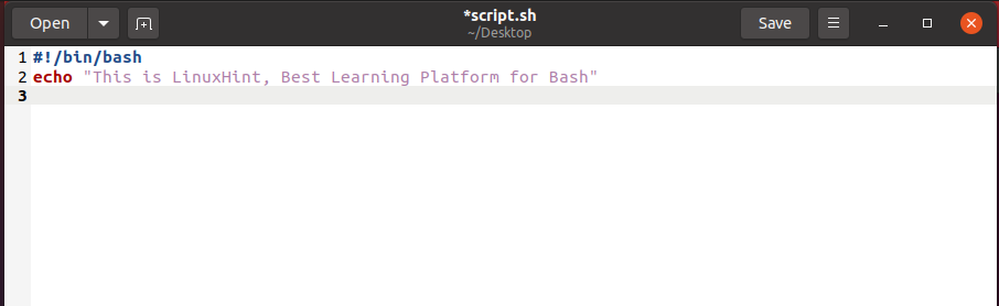 This is a standard first-line for every bash scripting file which helps it to be recognized as a bash script. Any script not having #!/bin/bash in the first line would not be considered as a bash script, so be sure to add this line to the top of every script. Once you have this line added, now you can start writing into the script. For example, I’d write here a simple echo command: