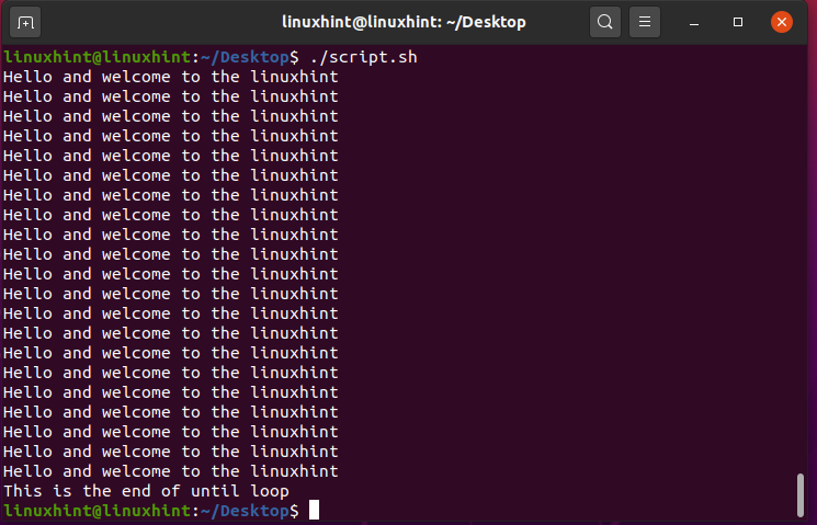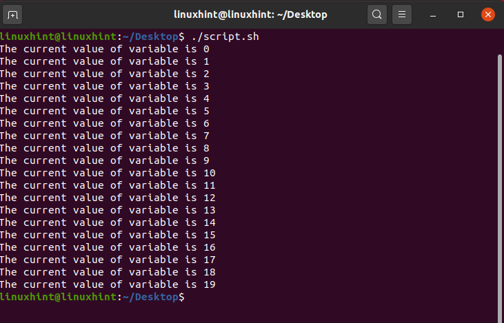 Let’s implement the until loop in our script.sh file. The until loop will run unless the condition is false (The value of the variable is less than 20)