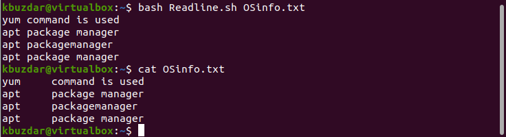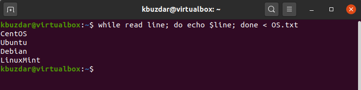Let’s take an example in which suppose we have a file named OS.txt containing the names of all important Linux distributions. If you want to read a file without using the ‘cat’ command then, for this purpose you can execute the following command to perform the particular task. We will use the while loop that will read each line from the file OS.txt and stores the content in each step in a variable $line that you can display later.