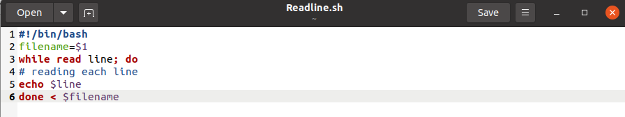 In a bash file, you need to add the following code script. In this script, we have to take a filename as an argument. First, the value of an argument is read by a $1 variable which has a filename for reading. It will check that filename exists at the specified location then using the while loop it read a file line by line similar to the previous example.