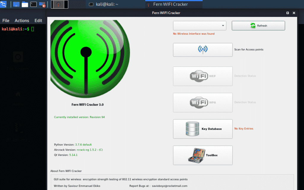A Python software tool that uses the Python Qt GUI library to perform wireless security attacks and auditing. Fern wifi cracker can crack and recover lost WPA/WEP and WPS keys. It can also launch network-based attacks on ethernet or wireless networks. It has a graphical user interface and very easy to use.