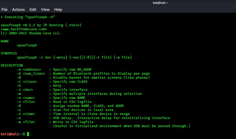 Spooftooph is a Bluetooth device automatic spoofing and cloning tool, and it makes a Bluetooth device disappear by cloning it. It can clone and save Bluetooth device information. It generates a new random Bluetooth profile based on the spoofed information, and the profiles get changed after a defined time. All you have to do is list down device information for Bluetooth interface and clone a device that is selected from a scan log.