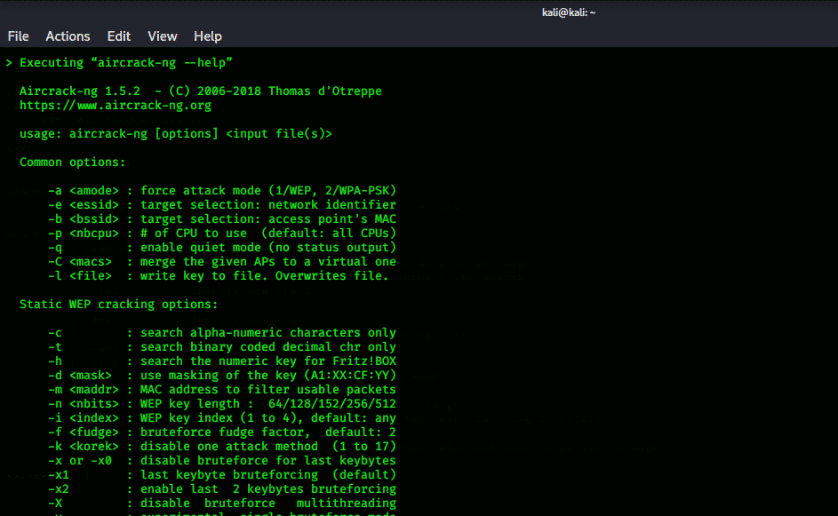 Aircrack-ng is one of the most popular toolkits in Kali Linux and is widely used in other distros as well. It is a key cracking utility for Wi-Fi 802.11 WEP and WPA-PSK, and through capturing data packets, keys are recovered. It launches Fluhrer, Mantin, and Shamir (FMS) attack with optimization attacks like PTW attack and KoreK attacks that in turns makes this WEP key cracking tool faster than other tools.