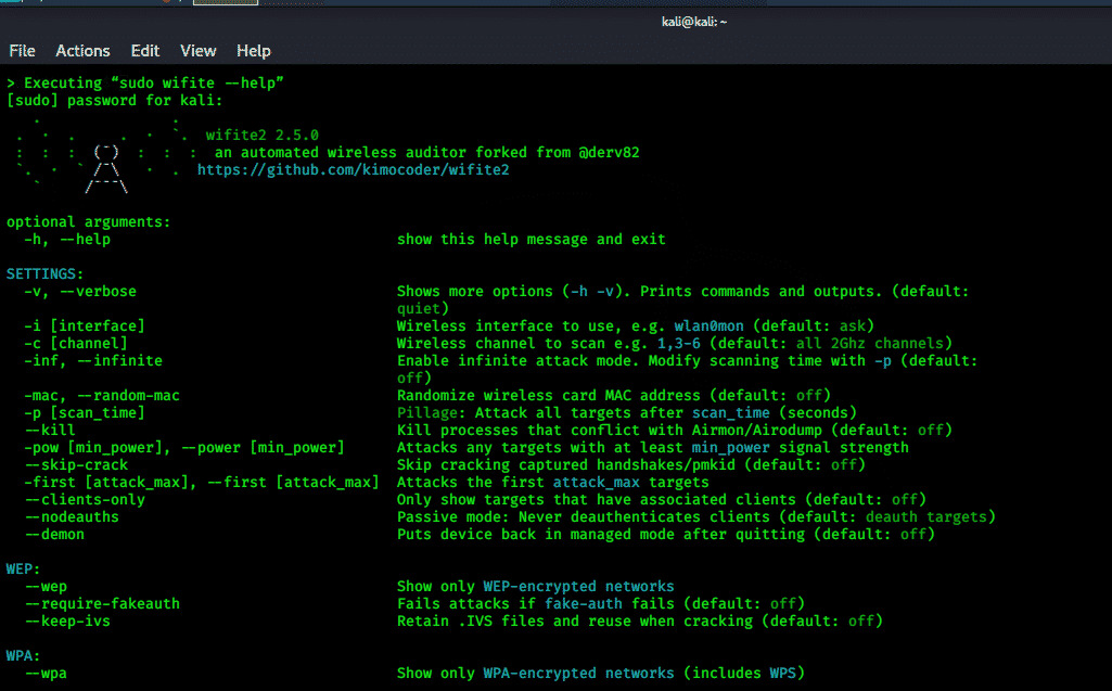 Wifite is a highly customizable tool with only a few arguments, and it is used for attacking networks that are encrypted by WEP, WPA, and WPS keys simultaneously. It is also known as “set it and forget it” auditing tool for wireless networks. It finds targets by their signal strength in which is measured in decibels (dB) and starts cracking the closest AP first. It de-authenticates clients on a hidden network to automatically show their SSIDs. It contains several filters for specifying a target for attack. It can change MAC address to a unique random address before attacking, and when it is done attacking the original MAC address is restored. Upon exit, the session summary is displayed with cracked keys, and cracked passwords are saved to local file cracked.txt.