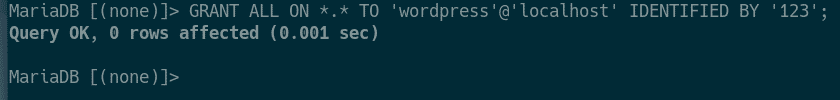 Now, create a new user wordpress, set a password for the user (let’s say 123) and grant the user permission to use all available databases with the following SQL statement:
