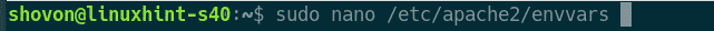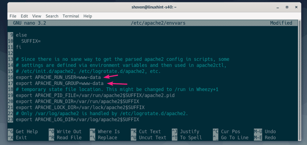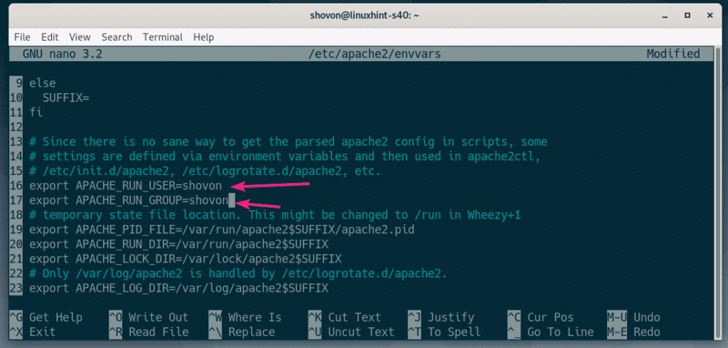Now, set APACHE_RUN_USER and APACHE_RUN_GROUP environment variables to your login user’s username. If you don’t know what the username is, you can use the whoami command to find it out.