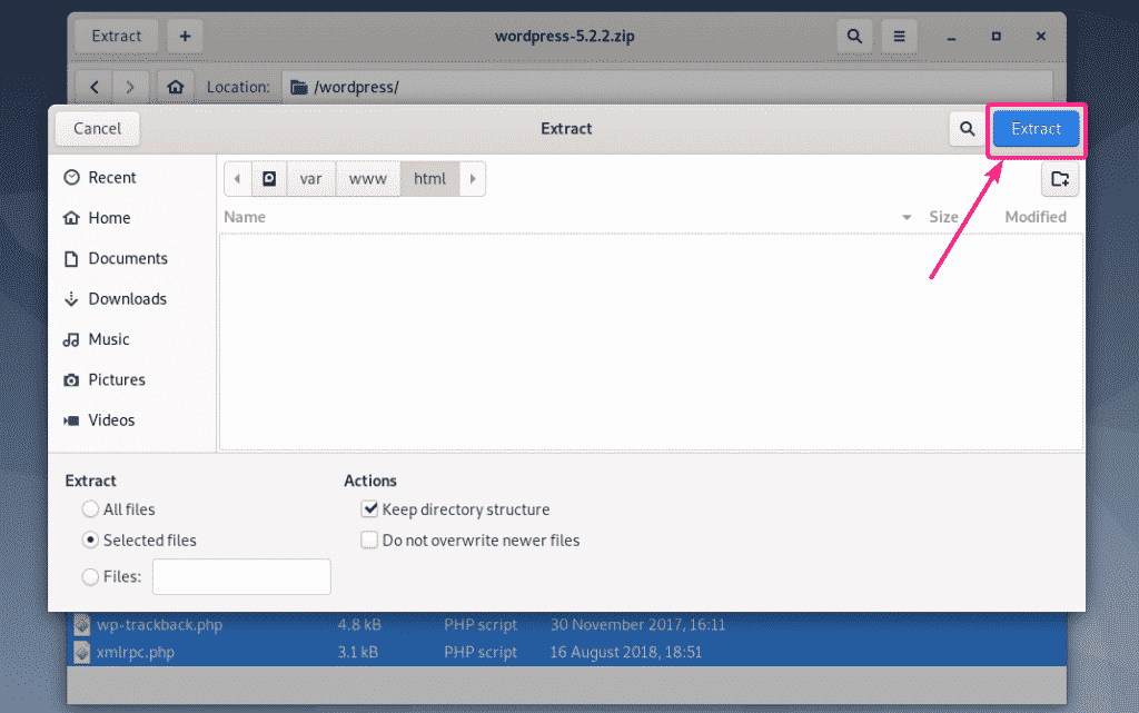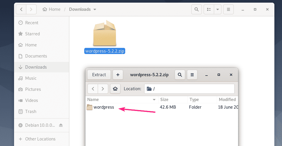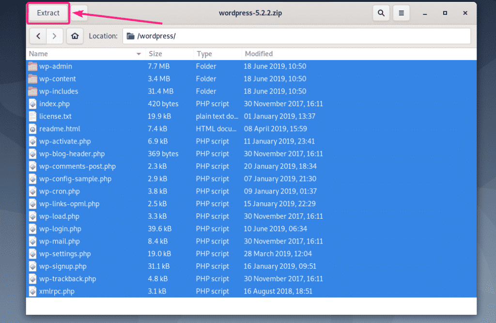 Now, double click on the WordPress archive file. The archive should be opened with Archive Manager. Now, navigate to the wordpress directory from the Archive Manager.