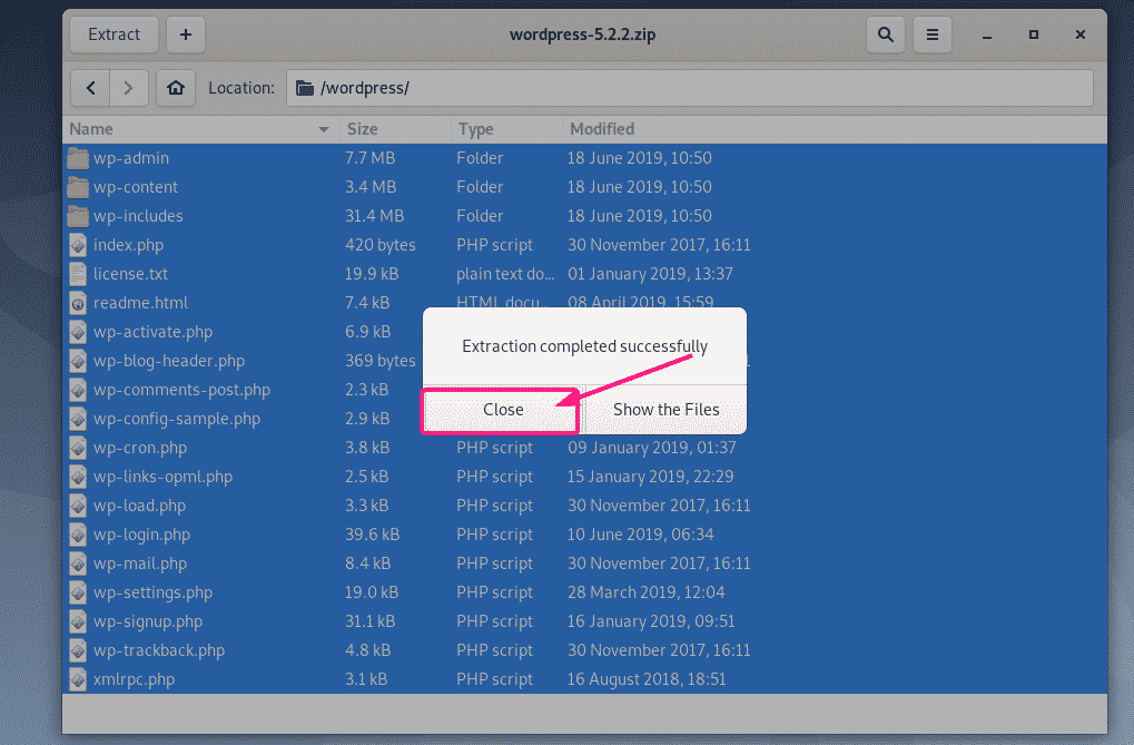 All the required files and directories should be extracted. Now, click on Close and close the Archive Manager.
