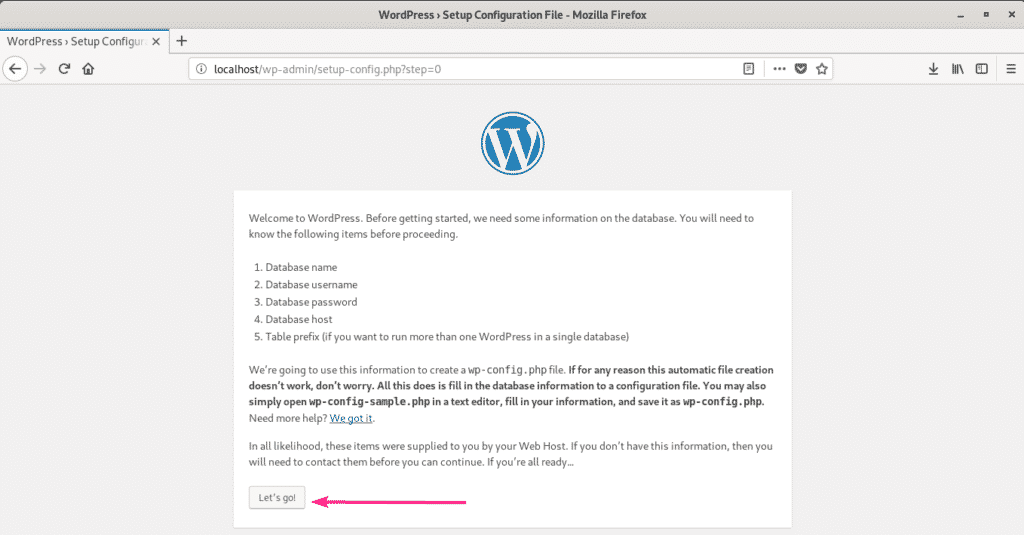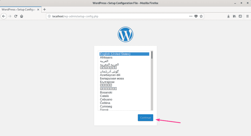 Now, visit http://localhost from your web browser. You should see the WordPress configuration page. Select your language and click on Continue.