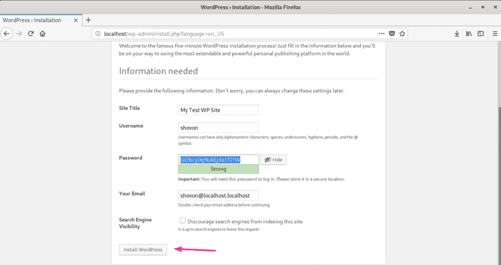 Now, type in your website information and click on Install WordPress. Be sure to note the username and password as you will need them later to manage your WordPress website.