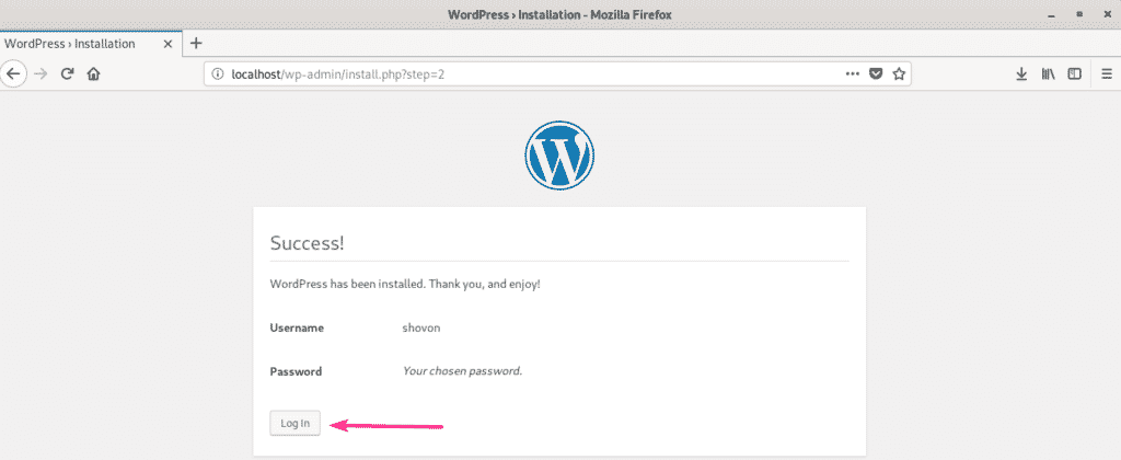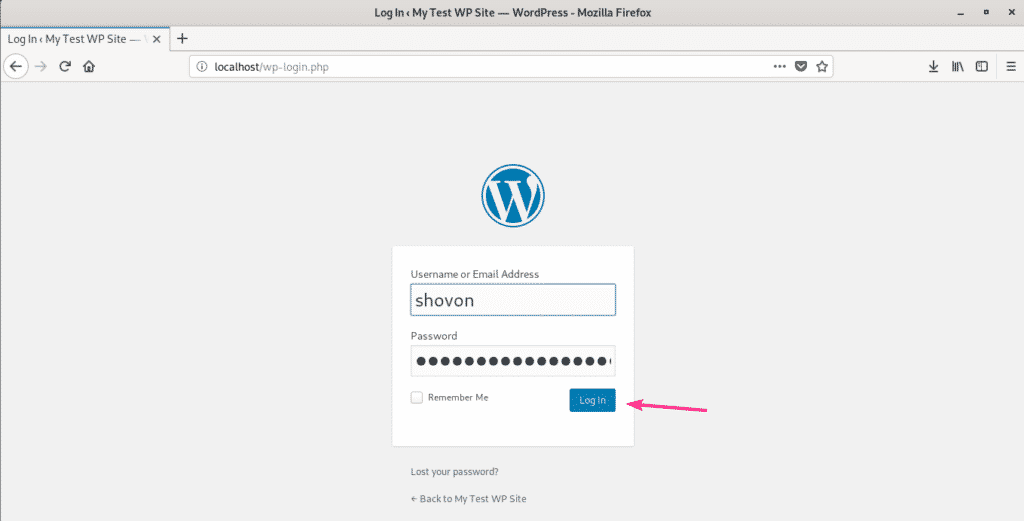 You should be taken to WordPress Admin login page (http://localhost/wp-login.php). Type in your username and password and click on Log In.