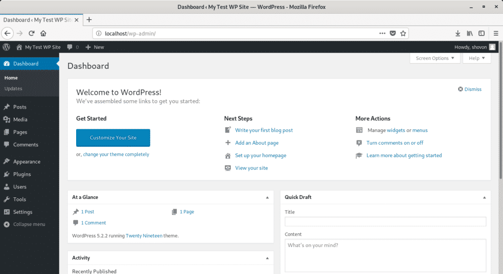 You should be logged in to WordPress Admin. Now, you should be able to set up your WordPress website the way you want.
