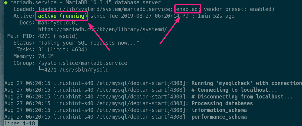 As you can see, the mariadb service is running. It’s also enabled to automatically start on system boot.