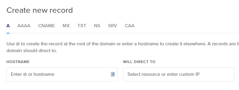 - Type @ as the hostname, and select the newly created Droplet where WordPress is installed as “Will redirect to”